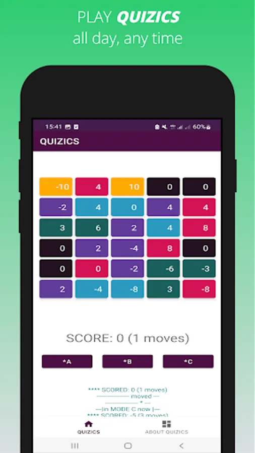 The game offers a basic help section for new and returning gamers, and allows the user to select from one of three play modes - A, B and C, all of which follow the same basic QUIZICS game rules (see the About section), but which offer unique game experiences.