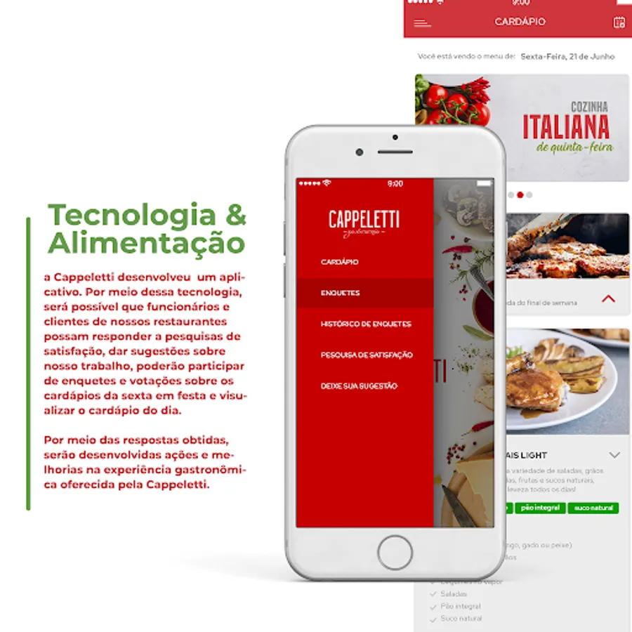 Cappeletti's app offers its users a practical and easy way to follow the daily menu served in your company. The application also allows the user to evaluate the service provided by Cappeletti and participate in special menu choices on holidays and events.