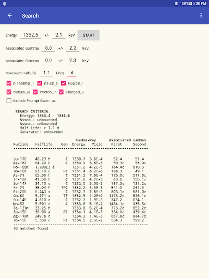 ● Nuclide Identification possibilities via a constrained database search based on observed gamma rays in a spectrum and some knowledge of the history of the spectrum. Useful items would include a minimum half life (estimated from the decay time), and possible modes of generation (nuclear reactor, accelerator, natural, etc.).