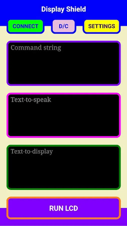 The app is default run in console view that displays Command String, Text-to-speech and Text-to-display fields. To switch into display mode, just press the 'Run LCD' button at the bottom of the screen.