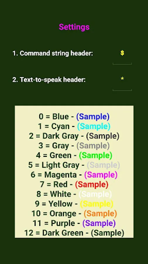 - To set the first line's text color to Yellow, send '$tc9' to the app (without the punctuation marks).