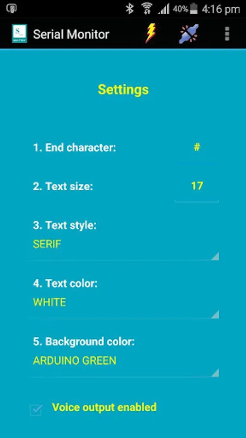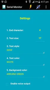 This Full version enables you to customize the GUI appearance such as text size, text color and background color (e.g. Arduino Green) at your choice. All the changes you made in the Settings menu will be saved and applied each time you start the app.