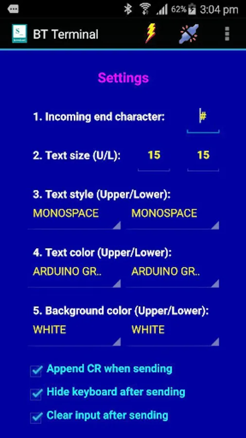 This app functions just like the Arduino IDE's Serial Monitor (writing and reading serial string) but in mobile and handy way.