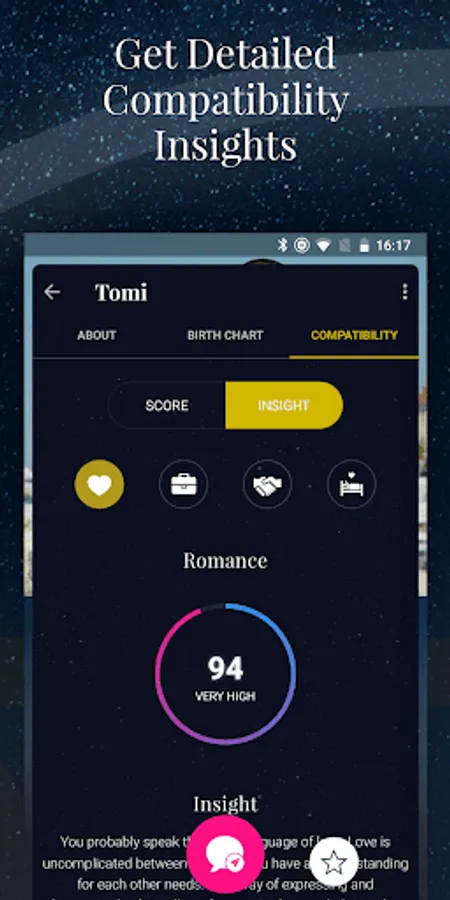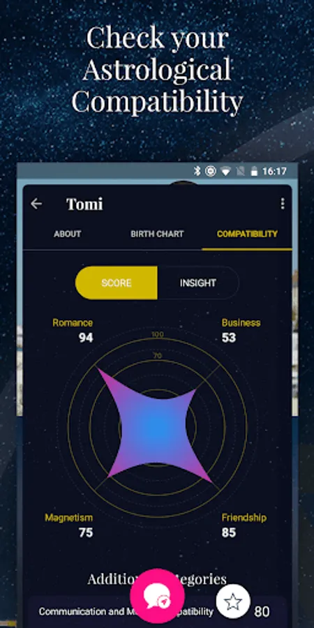 * Get valuable insights into the strengths of your Birth Chart compatibility with new people you discover or already know. Check your Synastry scores for Romance, Friendship, Magnetism (Chemistry) & Business.