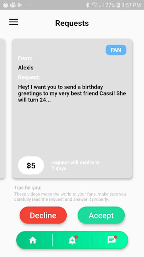 Stars on the app are able to accept or decline requests, track payments, edit their profile and adjust their pricing whenever they want.