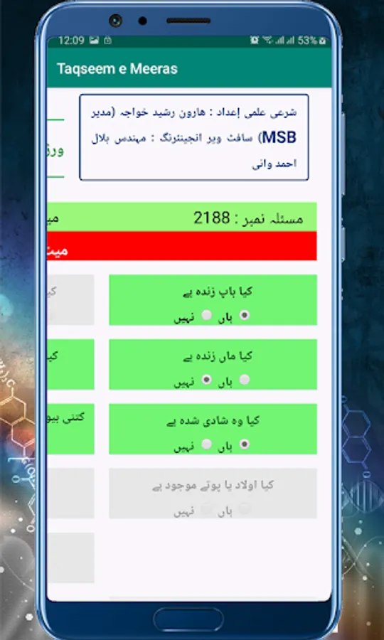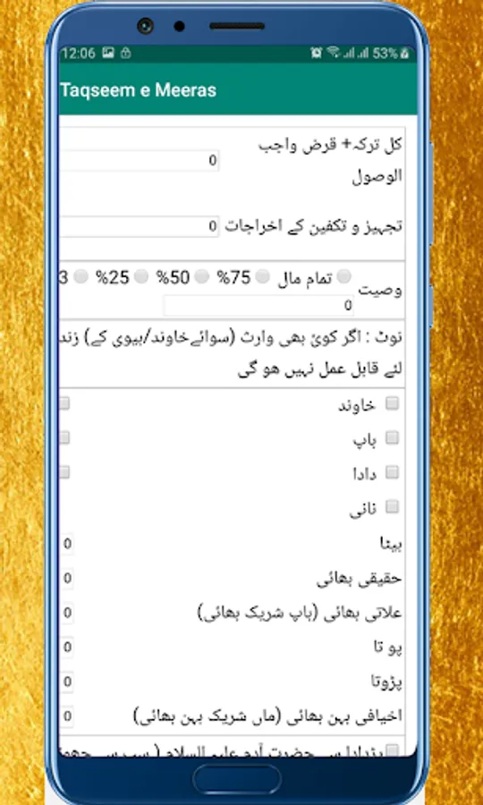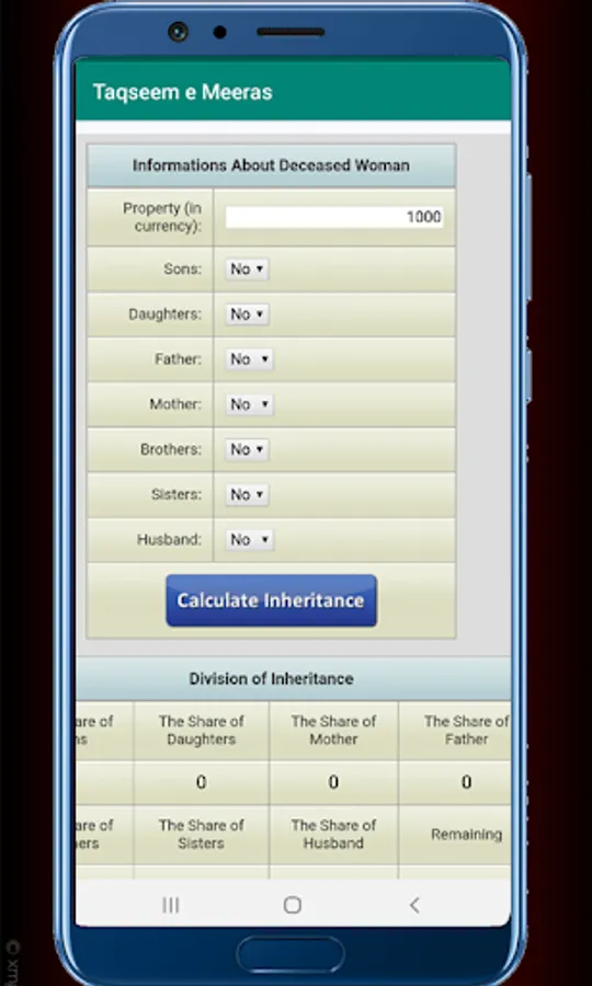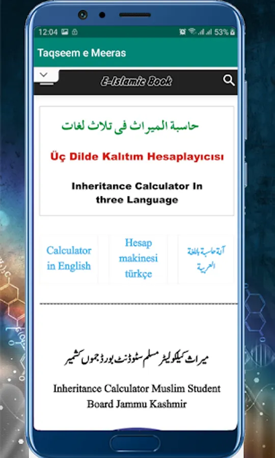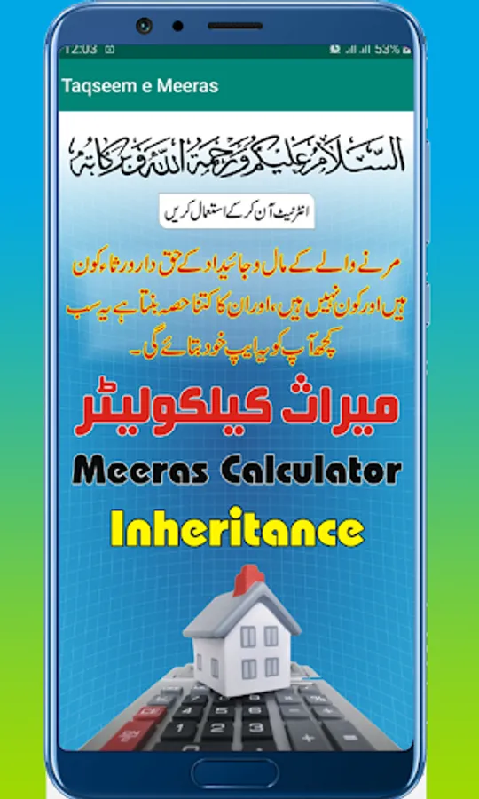 اس ایپلی کیشن میں تقسیم میراث سے متعلق ایک ایسا کیلکولیٹر دیا گیا ہے جو آپ سے چند سوالات کرے گا آپ ٹک مارک کرکے ان کے جوابات دیں، تقسیم میراث کا قرانی حل آپ کے سامنے چندمنٹوں میں آجائے گا۔ چار زبانوں اردو، عربی، انگلش، ترکی کی سہولت کے ساتھ یہ بہت ہی زبردست ایپ ہے۔