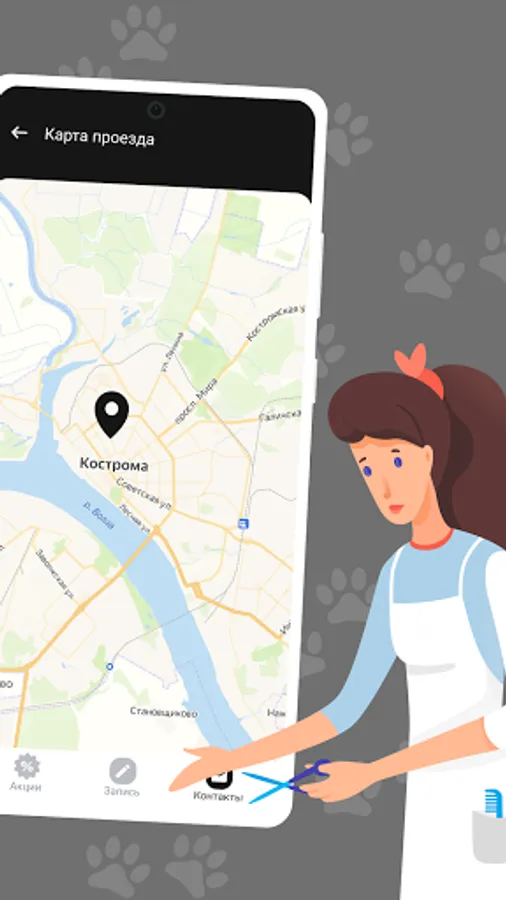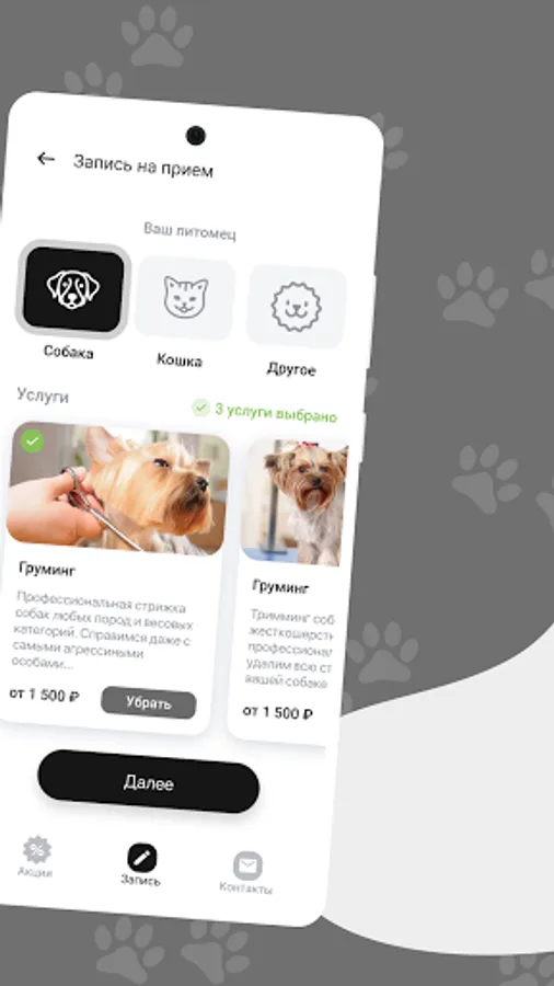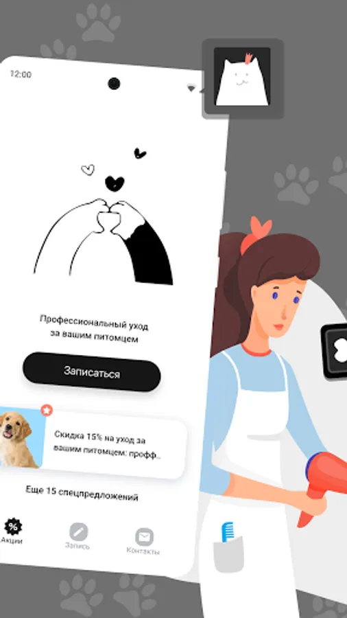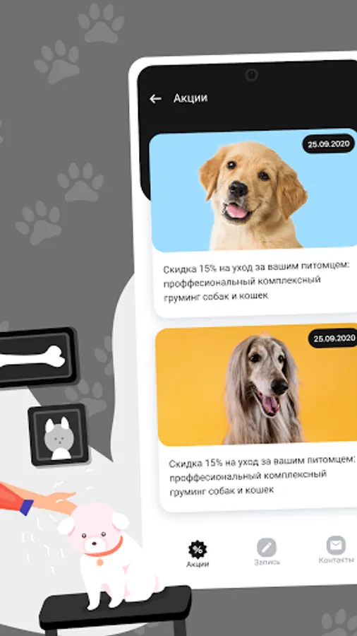 Here you can record your favorites online, participate in promotions and receive our special offers. The application will tell you when next time to register your pet for the procedure, as well as will not allow you to forget about the appointment!