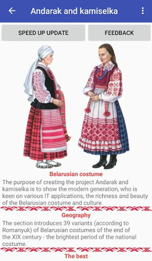 This app is developed to study Belarusian costume(stroy). Everyone thinks that national costumes should consist only of red and white colors, but this is far from being the case.