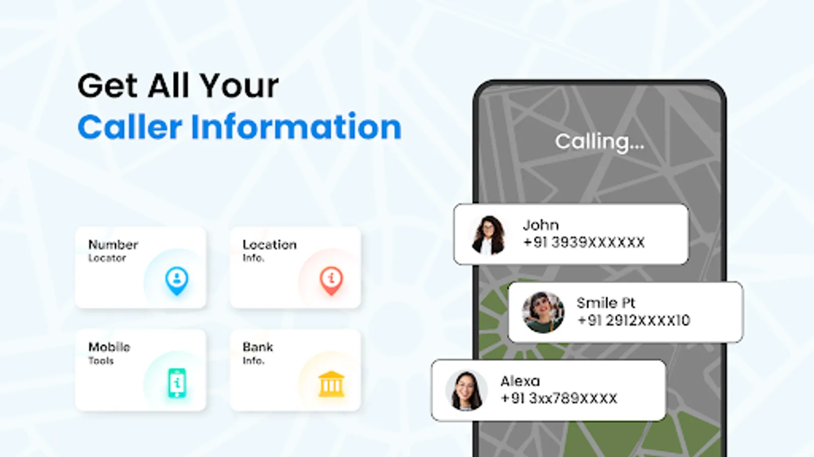 Caller name ID app offers powerful phone call features for Bank Call, you can also find Number Locator, STD code, ISD code, Number Locator, Robo calls, Get contact. Track caller location help you identify the mobile number locator, caller location behind an unknown number, and avoid spam calls without wasting time.