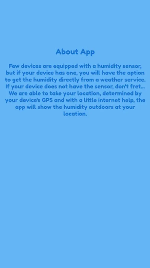 This app has the option to get the humidity directly from a weather service. If your device does not have the sensor, don't fret... We are able to take your location, determined by your device's GPS and with a little internet help, the app will show the humidity outdoors at your location.