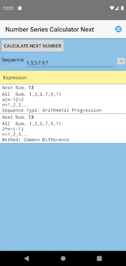 In addition to the next and missing numbers of the sequence, the application determines its type and formula (pattern).