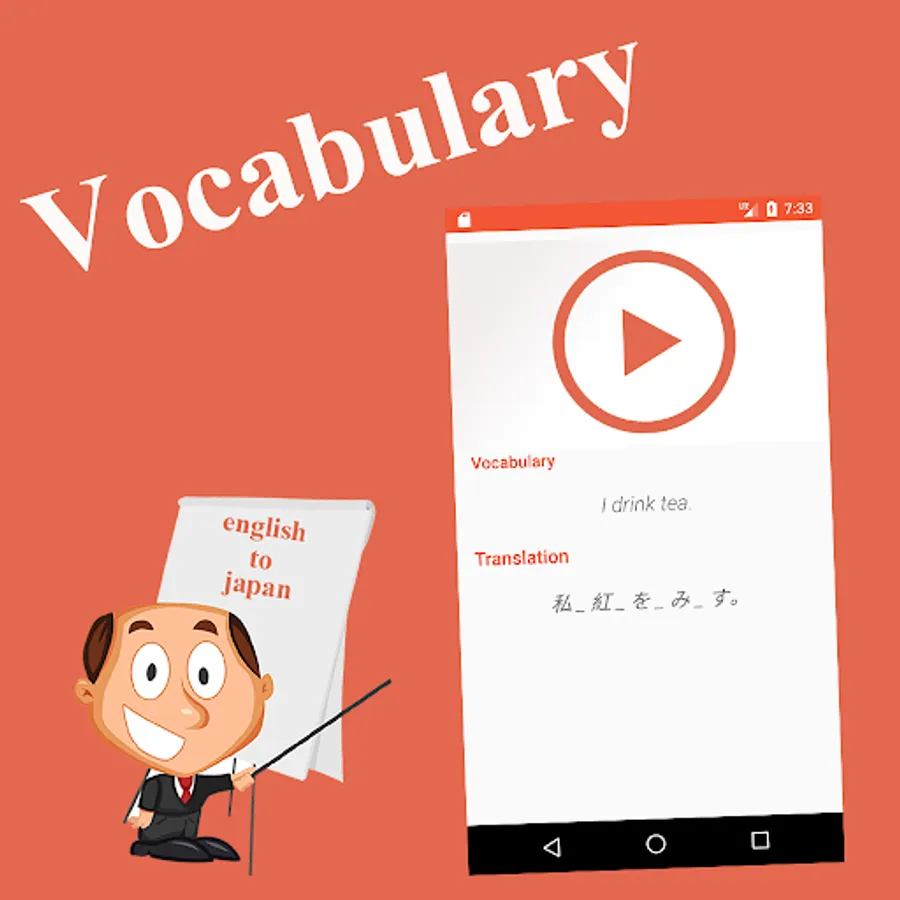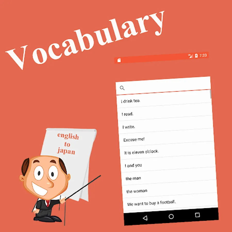 the app Japanese English vocabulary has both Japanese and English translation Japanese translation. It vastly more than 100 Japanese vocabulary. The audio reading Available without a net. You can learn anywhere, anytime.