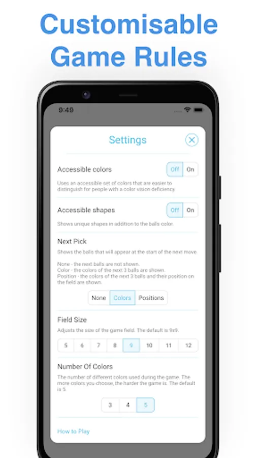 The game starts with a 9×9 board with five balls chosen out of seven different colours. The player can move one ball per turn and only if there is a path (a continuous line of vertical and horizontal empty spaces) between the ball's current position and the desired destination. The goal is to remove balls by forming lines (horizontal, vertical or diagonal) of at least five balls of the same colour. If the player succeeds in forming such lines of at least five balls of the same colour, the balls in these lines disappear and he scores points and gains a turn. If not, three new balls are added. The game continues until the board is full.