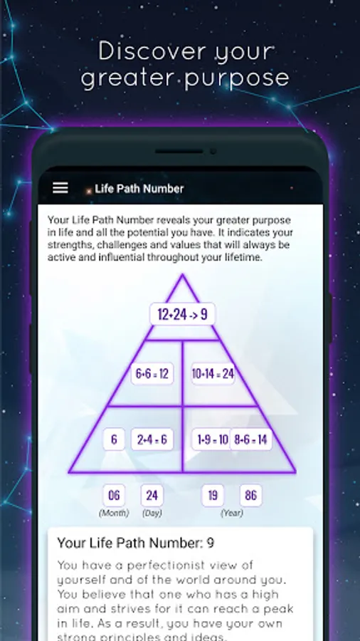 Your Life Path Number reveals your greater purpose in life and all the potential you have. It indicates your strengths, challenges and values that will always be active and influential throughout your lifetime. It is based on your date of birth and uses a numerology chart with the Pythagorean method.