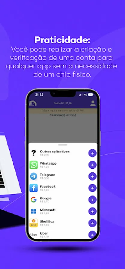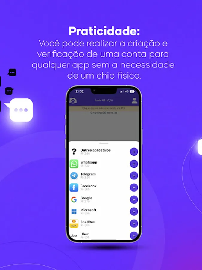 With our virtual numbers, you can create accounts on major apps such as WhatsApp, Facebook, Telegram, Kwai, iFood, Tinder, TikTok, Google and many others. It's your choice!