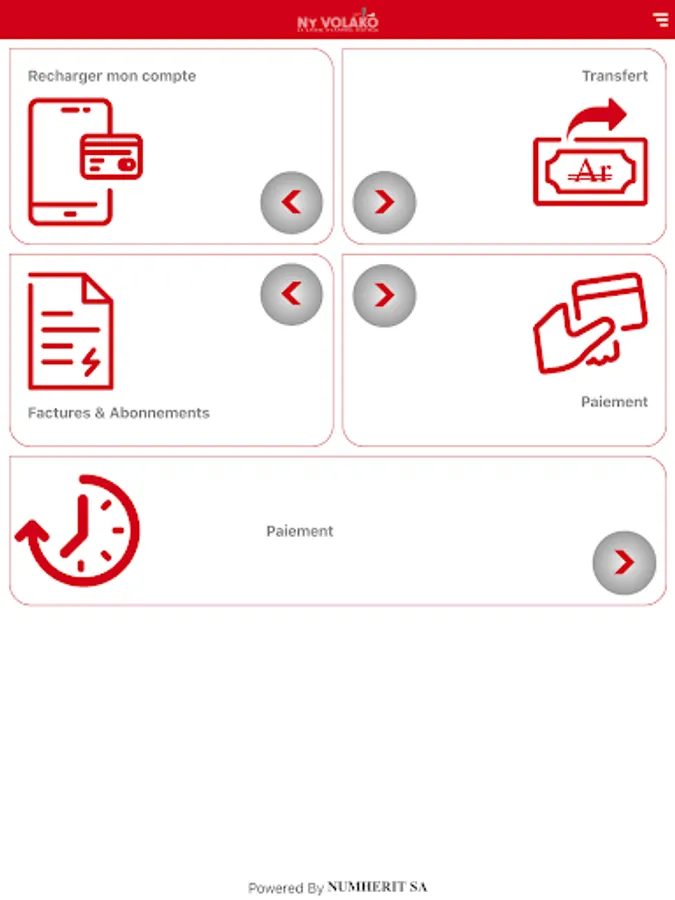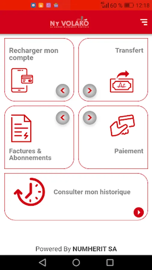 Developed by NUMHERIT SA, the Ny Volako mobile application allows you to carry out your financial transactions using your smartphone or tablet and an internet connection.