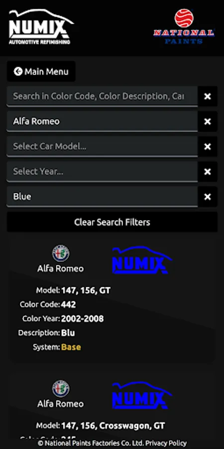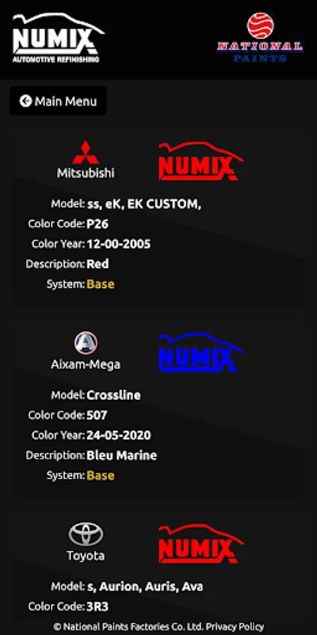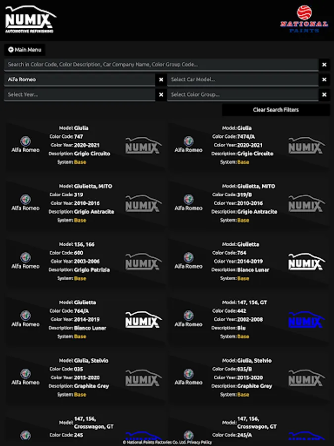 The system provides a complete variety of color combinations that enables the user to obtain colors for different cars of all brands known in the world, through a specially designed software. It is also possible to make RAL and BS colors using Numix paints.