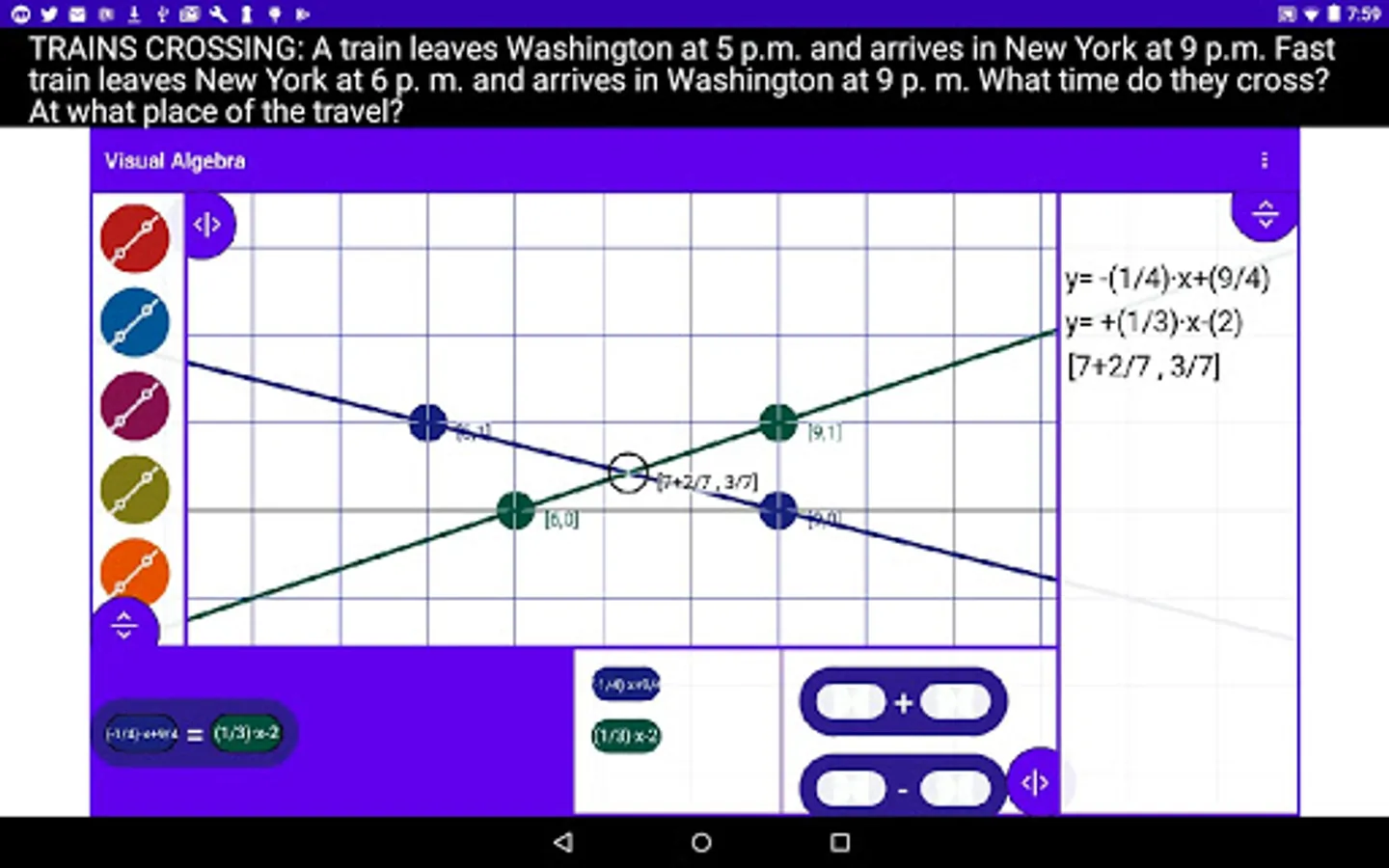 TRAINS CROSSING: A train leaves Washington at 5 p.m. and arrives in New York at 9 p.m. Fast train leaves New York at 6 p. m. and arrives in Washington at 9 p. m. What time do they cross? At what place of the travel?