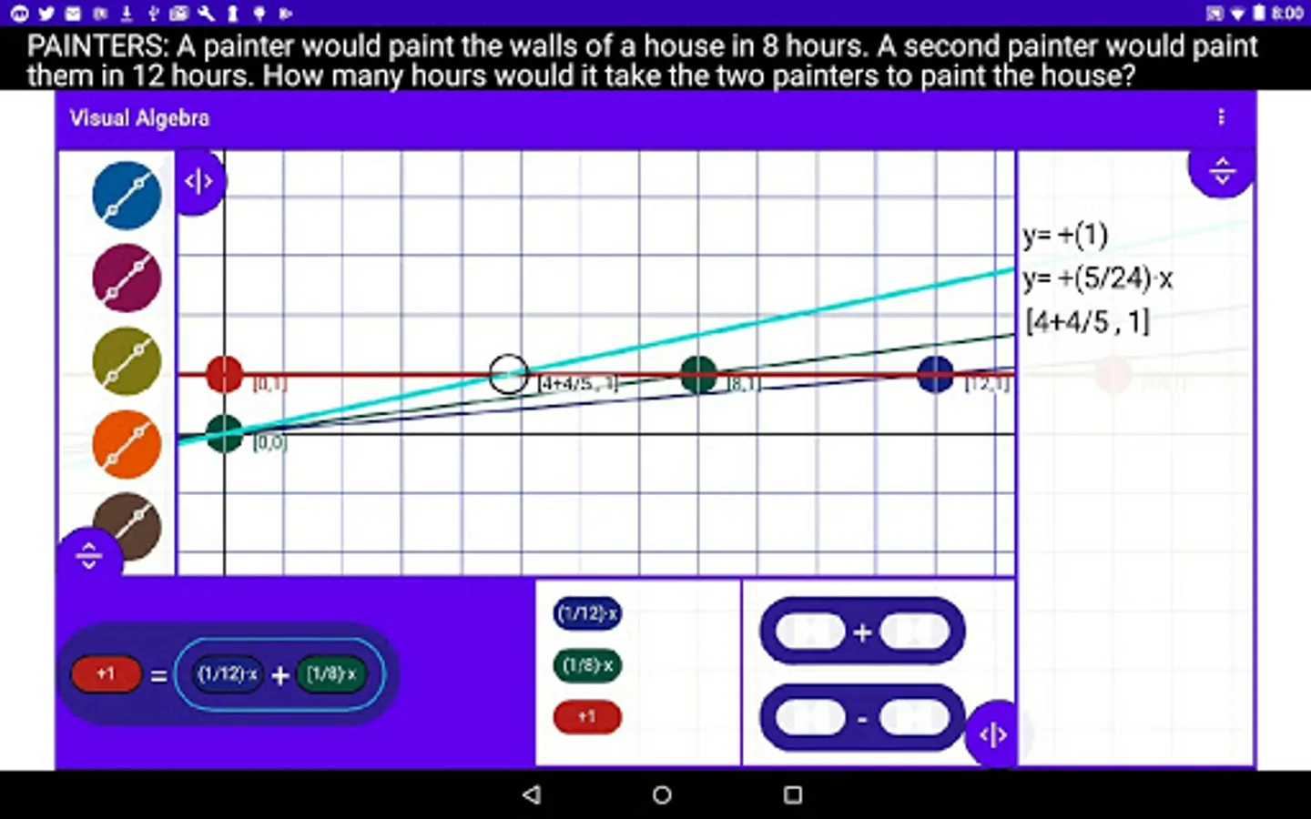 PAINTERS: A painter would paint the walls of a house in 8 hours. A second painter would paint them in 12 hours. How many hours would it take the two painters to paint the house?