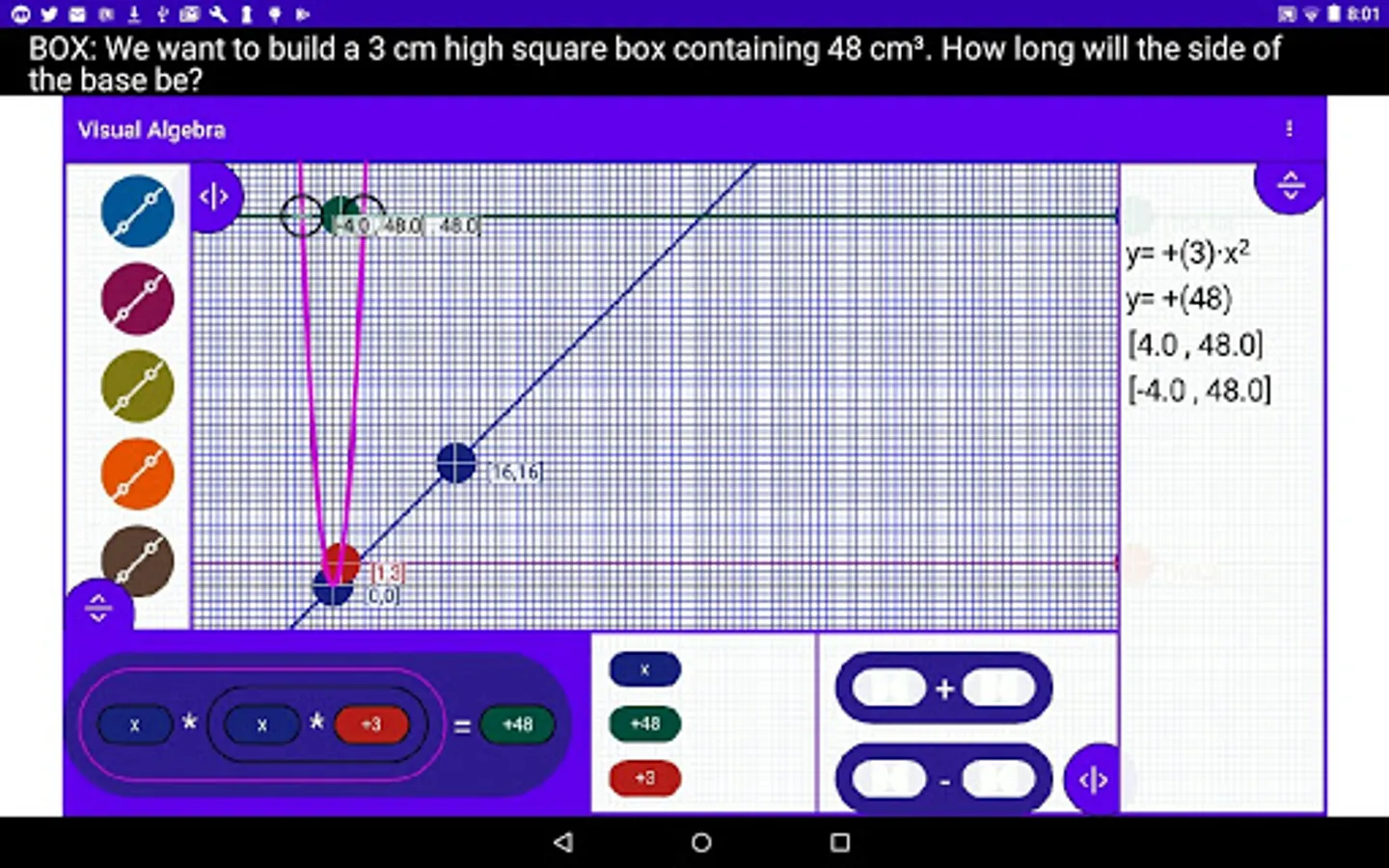 BOX: We want to build a 3 cm high square box containing 48 cm³. How long will the side of the base be?