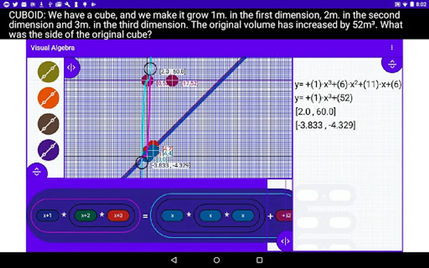 CUBOID: We have a cube, and we make it grow 1m. in the first dimension, 2m. in the second dimension and 3m. in the third dimension. The original volume has increased by 52m³. What was the side of the original cube?