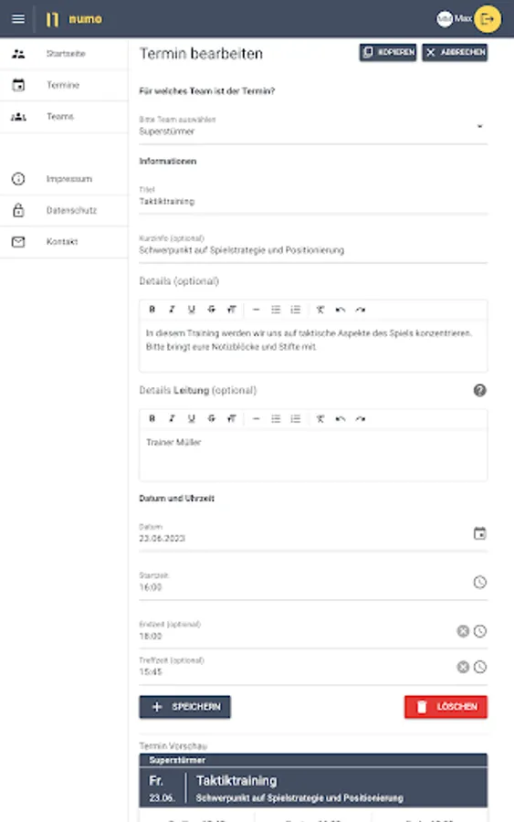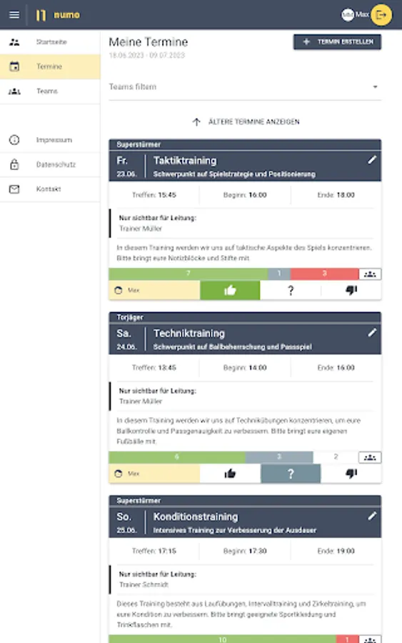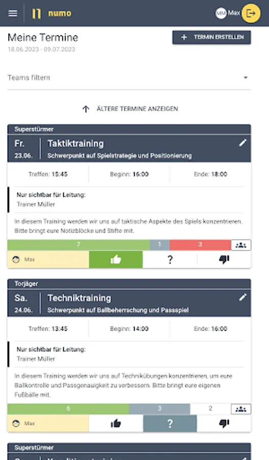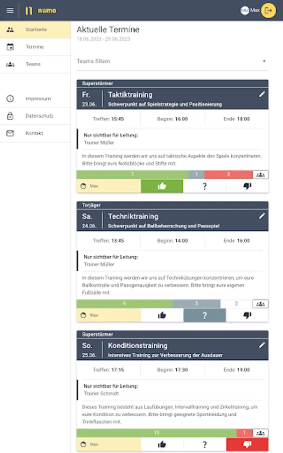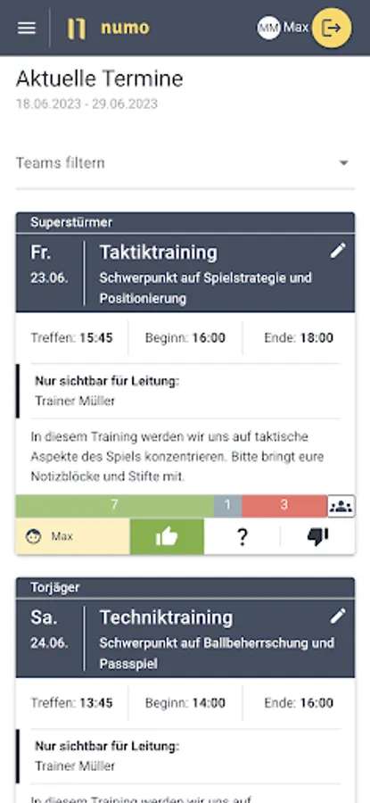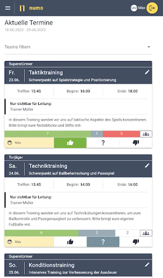 With numo, coaches can be more aligned and respond quickly to questions from players, parents, or colleagues. We know your time is valuable and we want to help you make the most of it. Data only has to be collected once and is then always at hand - whether it is training times, contact details or attendance lists.