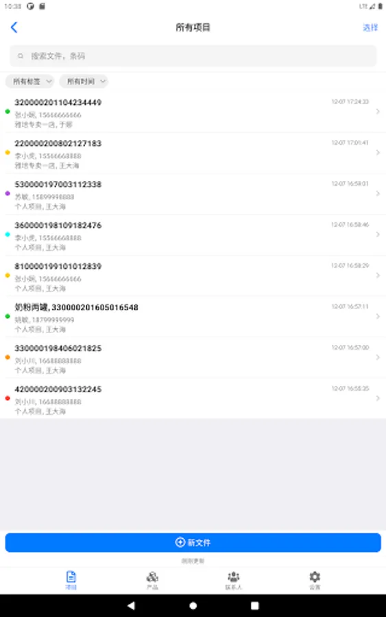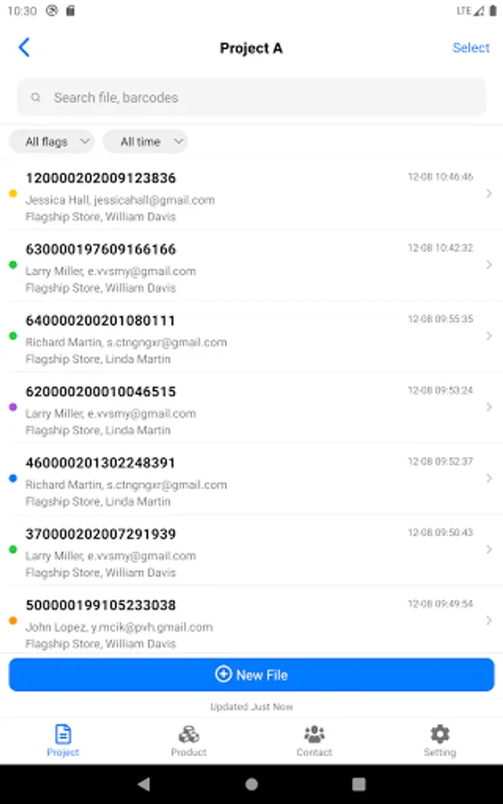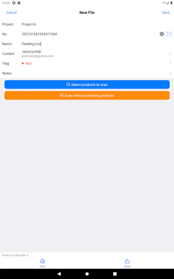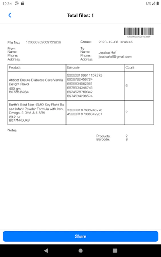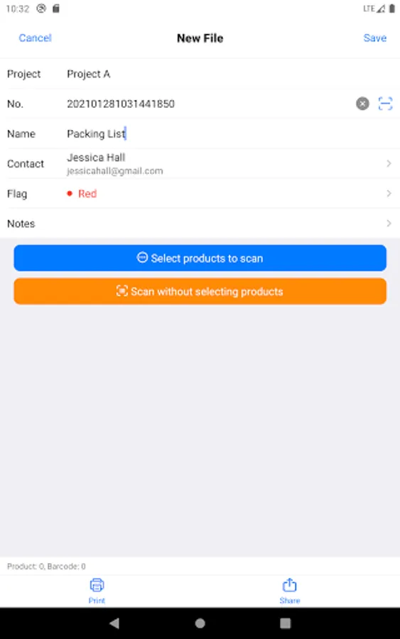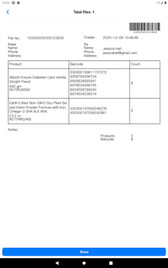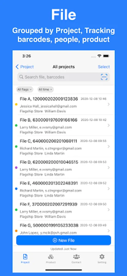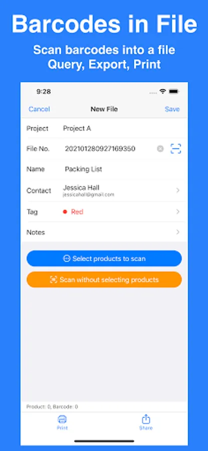 Each barcode (or QR code) is scanned into a FILE under a PROJECT. The FILE has optional attributes, such as file number, file name, contact (customer), tag to help you query and tracking barcodes. You can search barcodes by contact, product and vice versa. To access your data from PC, visit www.ndok.com.