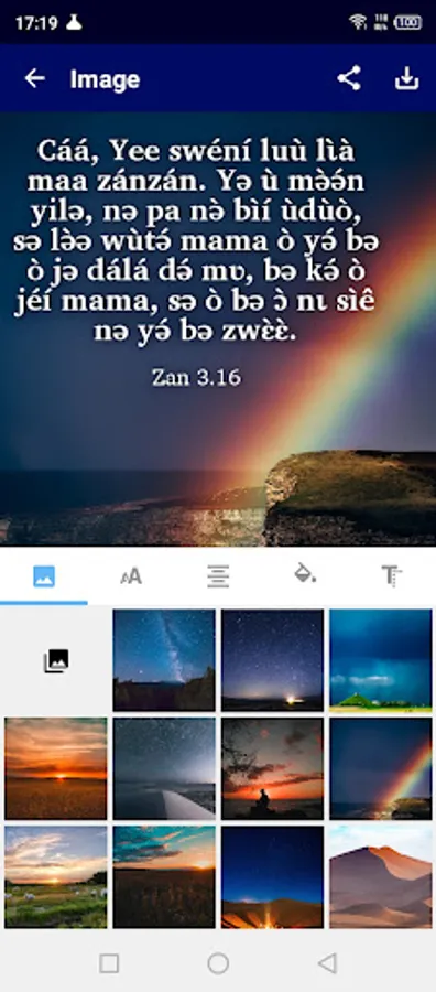 • When you tap on a verse, an image button is displayed on the bottom toolbar. When this button is pressed, the screen appears. You can choose the background image, move the text around the image, change the font, text size, alignment, format and color. The final image can be saved on the device and shared with others.
