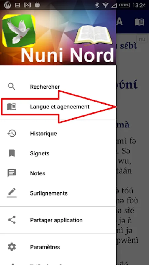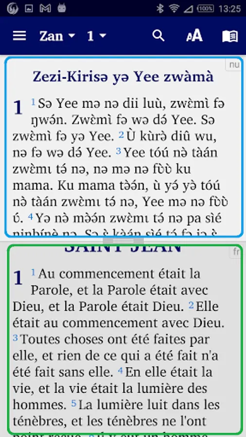 - "verse by verse" to display a verse in Nuni followed by the same verse in French or in English.