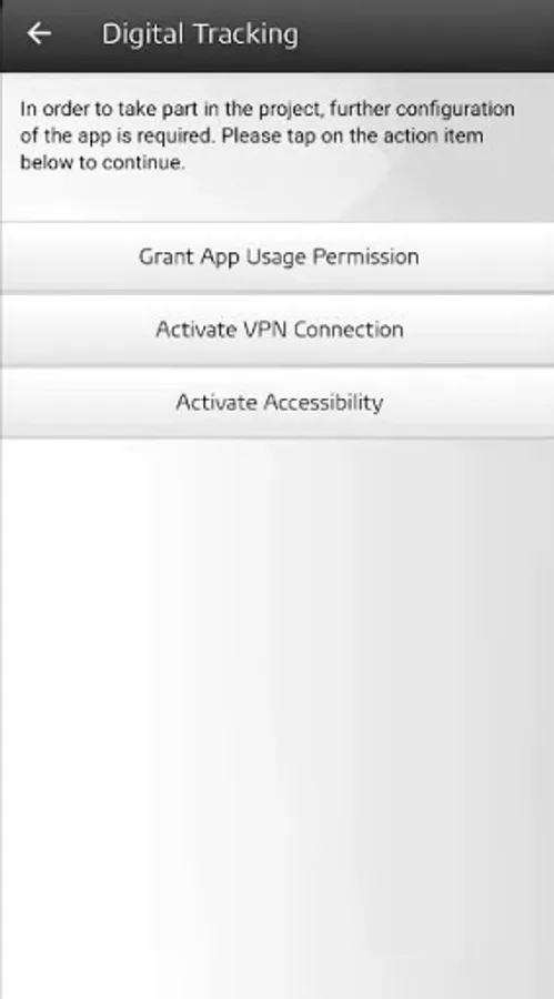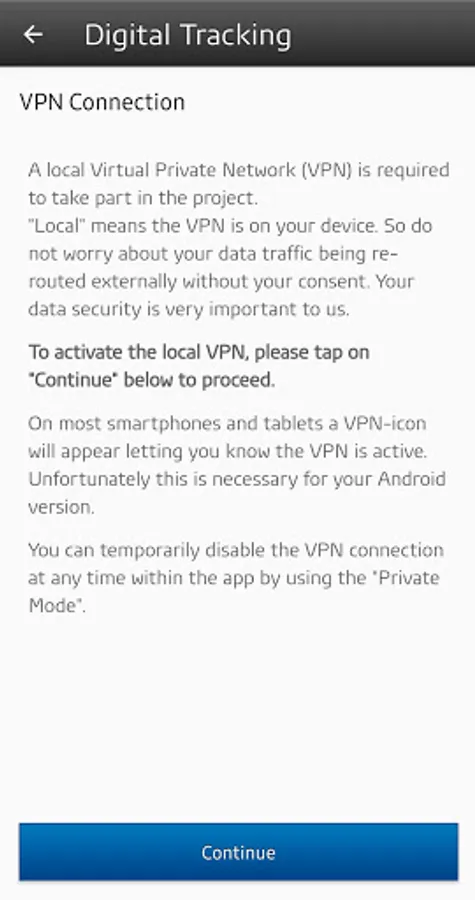 You will need to enable VPN service in order to participate in this study. The VPN service is required to analyze the websites used on this device.