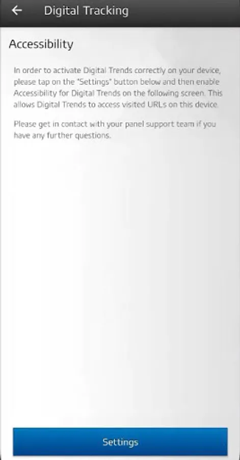 You will need to enable Accessibility services in order to participate in this study. The Accessibility services are required to analyze the websites used on this device.