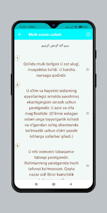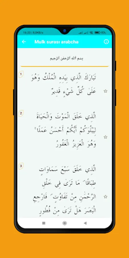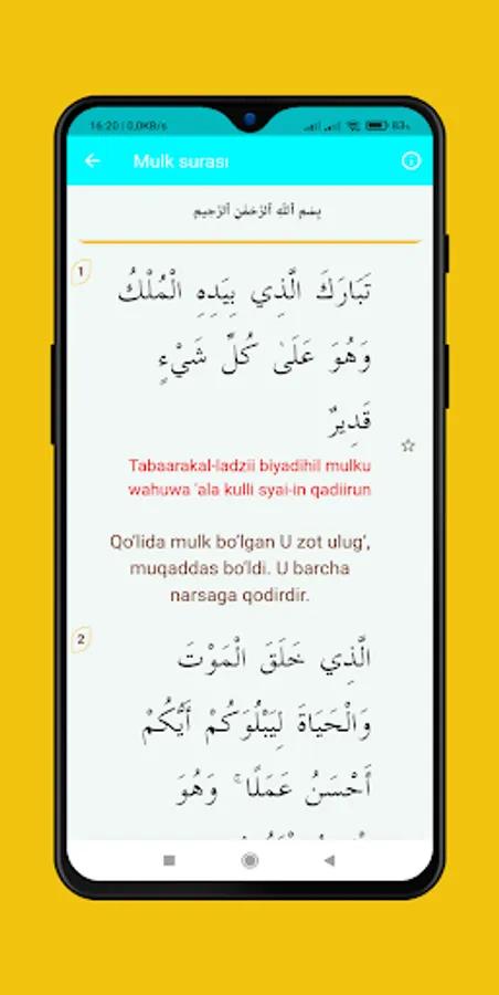 Sura Mulk in Ushbu ilovada arab tilida o'qishingiz mumkin. O'zbekcha talaffuzini topib mp3 sifatida tinglashingiz mumkin.