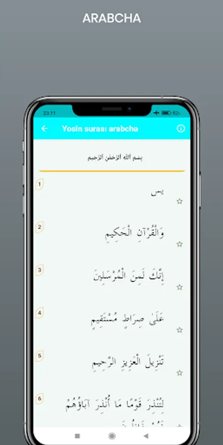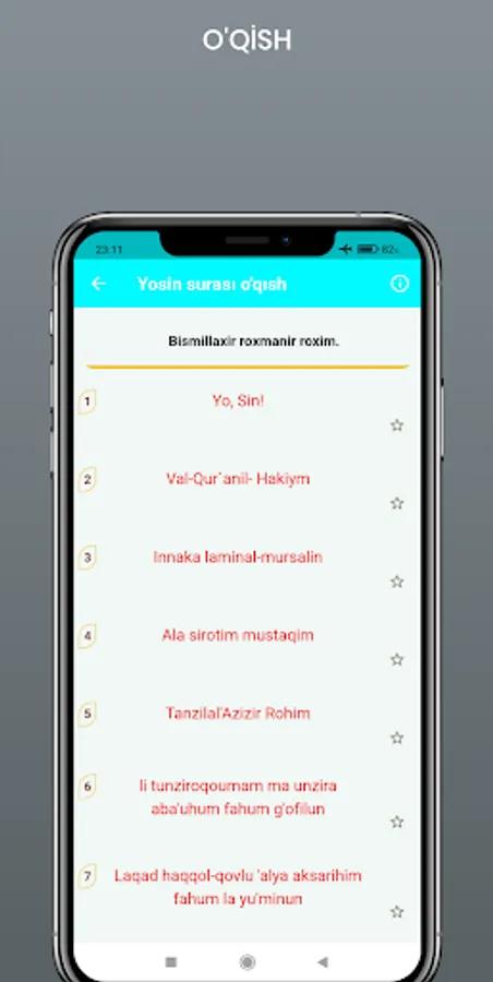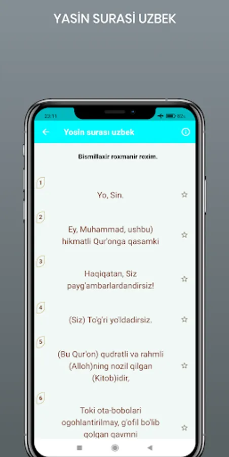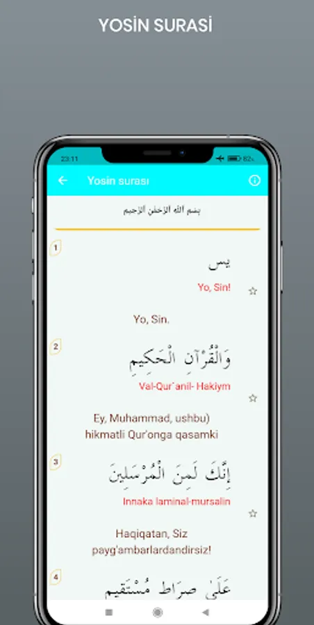 You Yasin Sura Mp3-ni ilovada tinglashingiz mumkin, you arab tilidagi qiroatni alohida-alohida va o'zbekcha tarjimasini o'qishingiz mumkin.