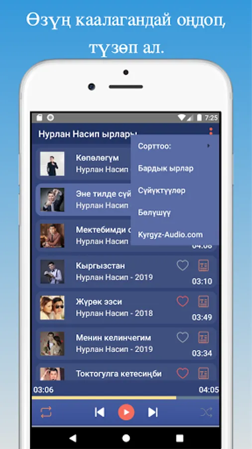 If you press the "Repeat" button, a song will be repeated. If you click the "Mix" button, the application itself will select and play different songs.