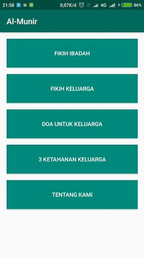 AL-MUNIR: Muslim Family Resources is a science media for Muslim families to learn basic knowledge about Islam. Media containing basic problems and Jurisprudence worship and prayers the family is made simple and practical to assist Muslims in their families to prepare themselves in worship and build a harmonious family. So that the media has become one endeavor realize maslahah Muslim family, sakinah, mawaddah, and mercy.