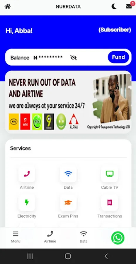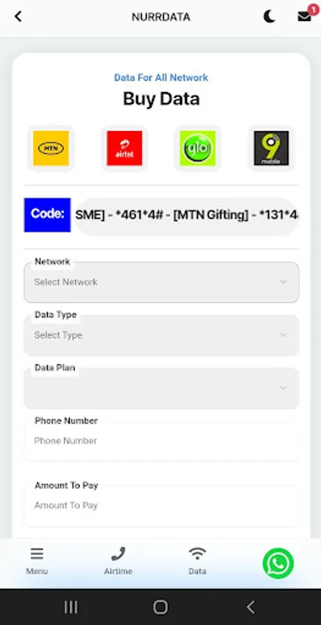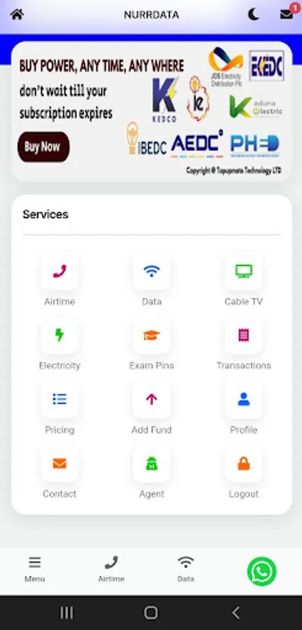 We offer the cheapest data prices for Mtn, Glo, Airtel & 9mobile networks as well as airtime across all networks. Pay for cable Tv subscriptions Dstv, Gotv, Strong, & Startime. We also offer payment of electricity bills & Waec, Jamb, Nabteb, & Neco scratch card pin purchase.