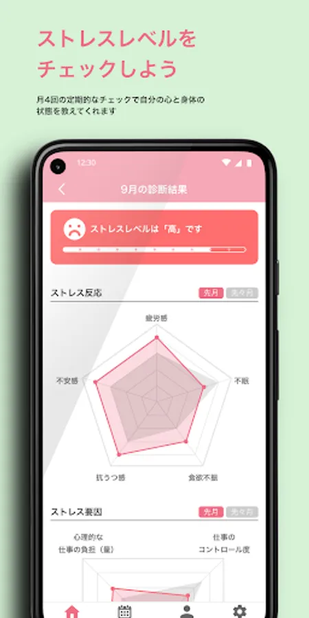 Simple graphs show your overall stress levels, stress reactions and stress factors compared to the previous month.