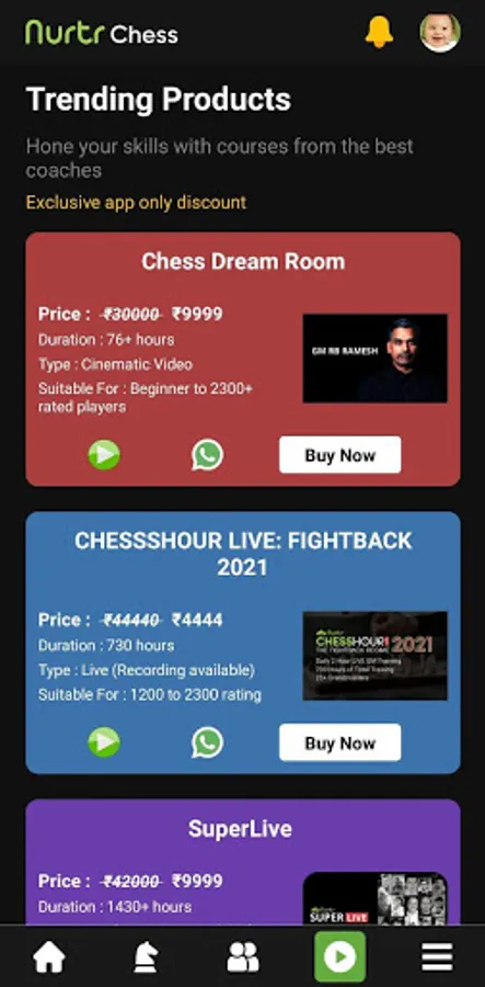 * Get access to the world’s best chess trainers and learn through live and interactive chess courses.