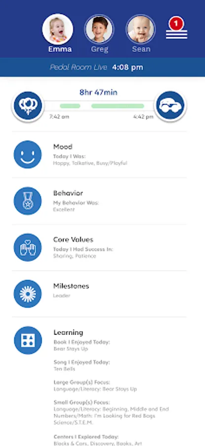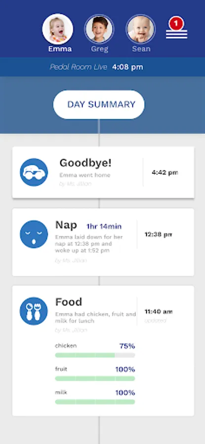 • Daily reports track your child’s meals, potty/diapers, nap, mood and activities