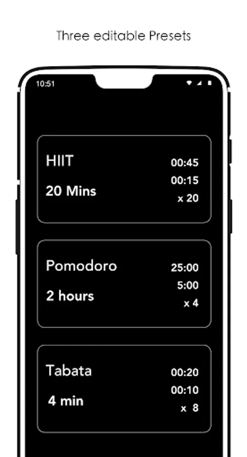 It comes with 3 presets for HIIT, Tabata and Pomodoro which can be edited to suit your needs.