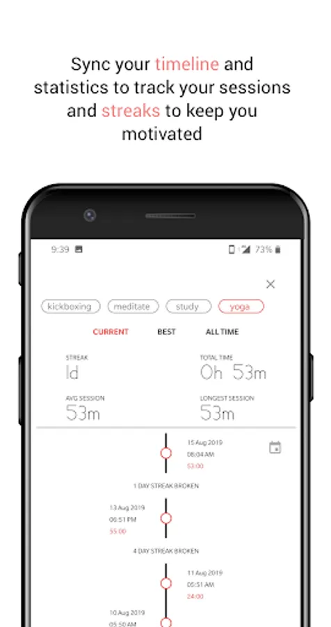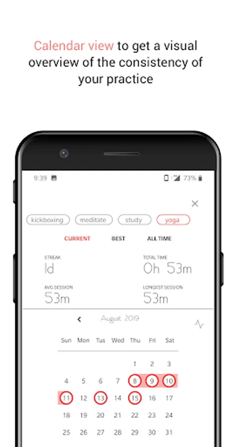- Under statistics, a Timeline view for details about session durations and a Calendar View for visual encouragement to maintain your streak.