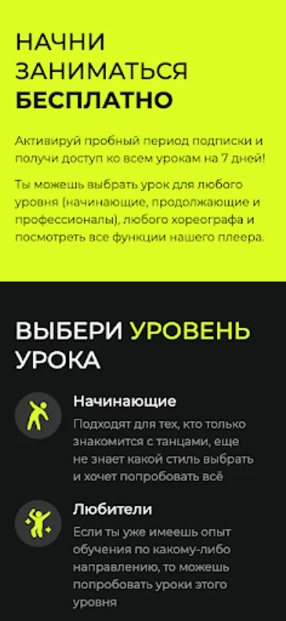 With our app and a functional video player with speed control, mirroring and video recording of the lesson from two sides, everyone will be able to dance, regardless of age, level and social status.