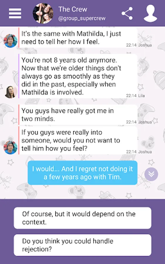 Chat with Lila and Joshua through group text messages and find out what to do together. Be part of the Crew!