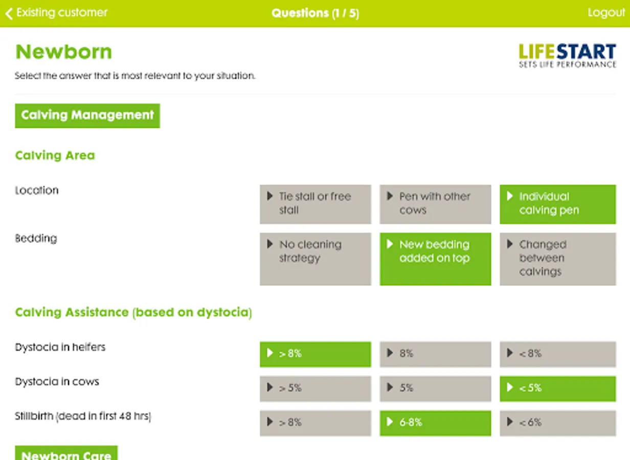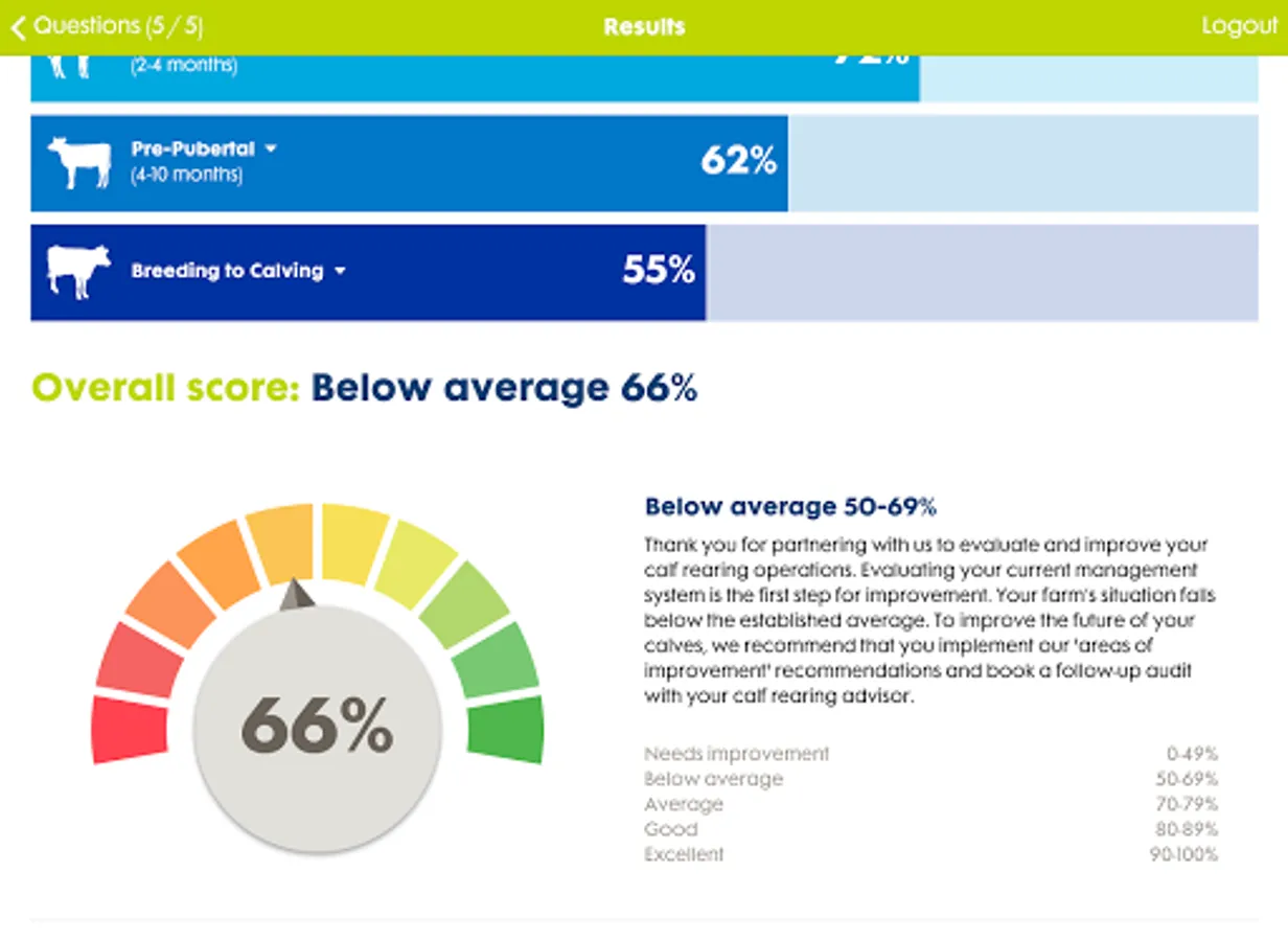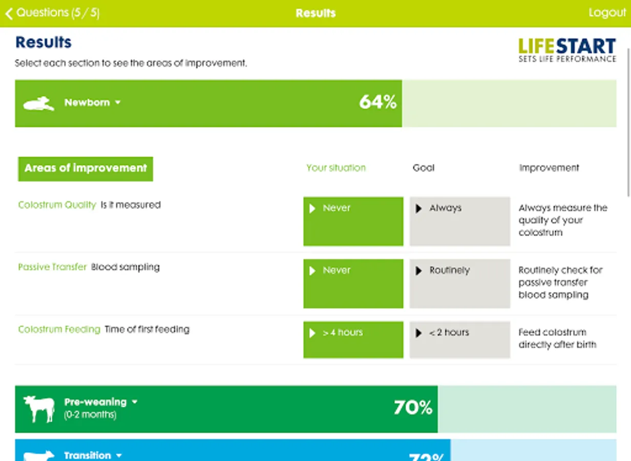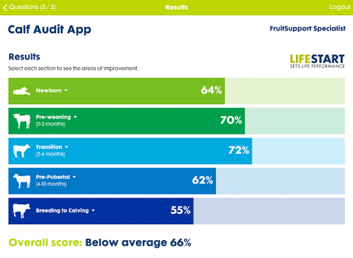 The LifeStart Calf Audit offers insight in the potential areas of improvement, through a list of questions and a dynamic calculation model. Based on your calf rearing approach, the LifeStart Calf Audit will score the four main elements in management: nutrition, health, hygiene and housing. You will receive a report with expert advice that provides clear assistance in how to refine your calf rearing strategy. This will benefit your farm’s performance.