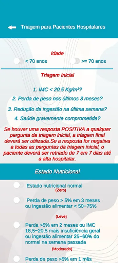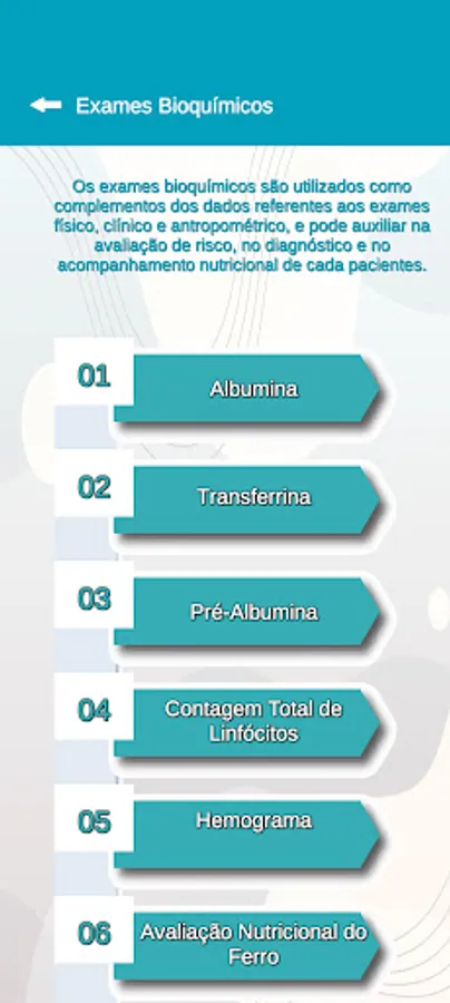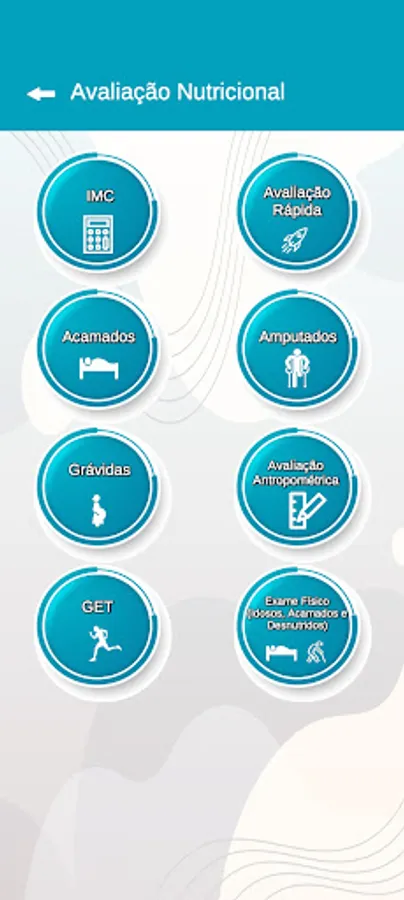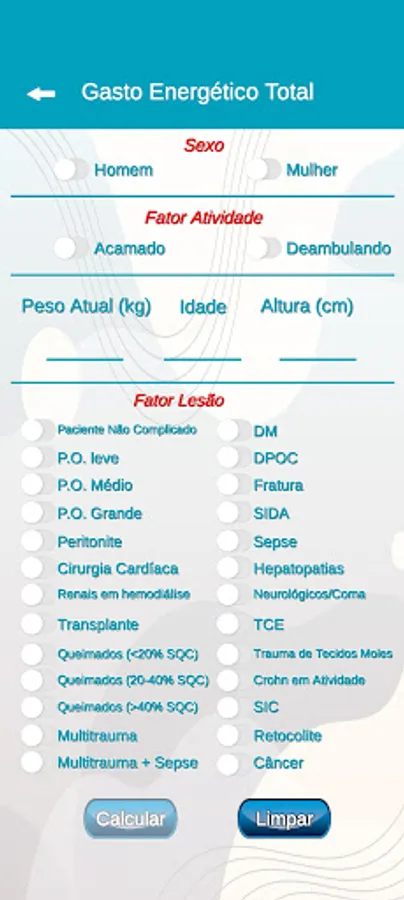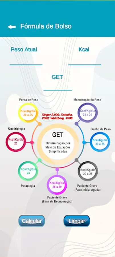 It includes Weight Adequacy calculation, Height Calculation, Weight Estimation in Amputees, Arm Circumference, Corrected Weight (Oedema), Total Energy Expenditure in bedridden, eutrophic and pocket formula, basic gestational calculations, BMI, Weight Loss Calculation Weight, Adjusted Weight, Estimated Weight, Ideal Weight, Rapid Assessment, Waist-Hip Ratio, Inpatient Screening, Auxiliary Physical Examination, 10 Steps to Adequate and Healthy Eating, Anion Gap, Body Surface Area, Calcium Correction in Hypoalbuminemia , Total Lymphocyte Count, Friedewald Equation for Low Density Lipoprotein (LDL-C), HOMA Formula, Biochemical Tests (Albumin, Electrolytes, Digestive Enzymes, Nutritional Assessment of Iron, Glycemia, Complete Blood Count, Total Lymphocyte Count, Lipidogram, Pre Albumin, Renal Function, Transferrin, Vitamins), Distribution of Macronutrients Calculation of Weight and Height in Bedridden Patients.