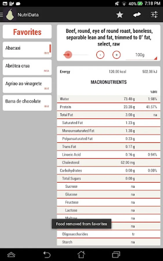 You can search for the food you want to find, or sort them in an alphabetical order. You can also see categories of food or search by what nutrients they contain. You can add foods to a favorites list and you can view the comparison of the nutritional information of two foods. Change the portion size and watch as the nutrients change to suit the new value - it’s smart, intelligent and modern.