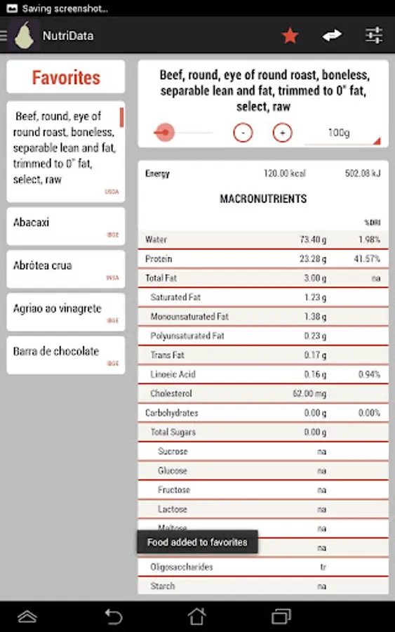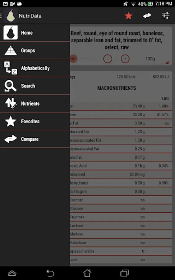You can search for the food you want to find, or sort them in an alphabetical order. You can also see categories of food or search by what nutrients they contain. You can add foods to a favorites list and you can view the comparison of the nutritional information of two foods. Change the portion size and watch as the nutrients change to suit the new value - it’s smart, intelligent and modern.