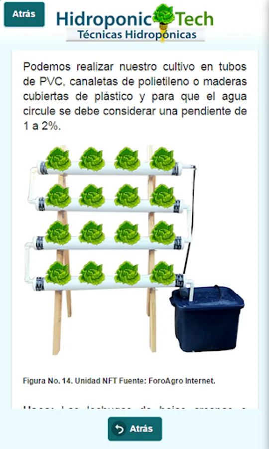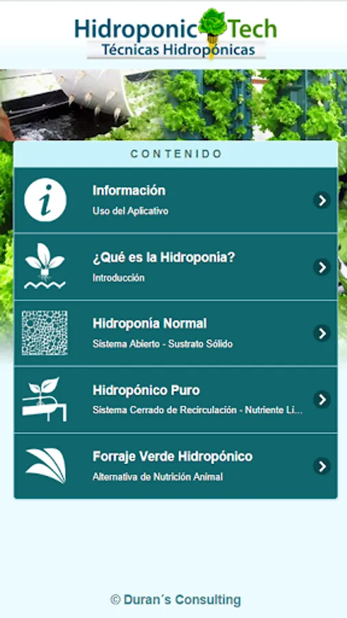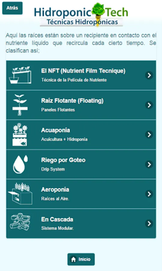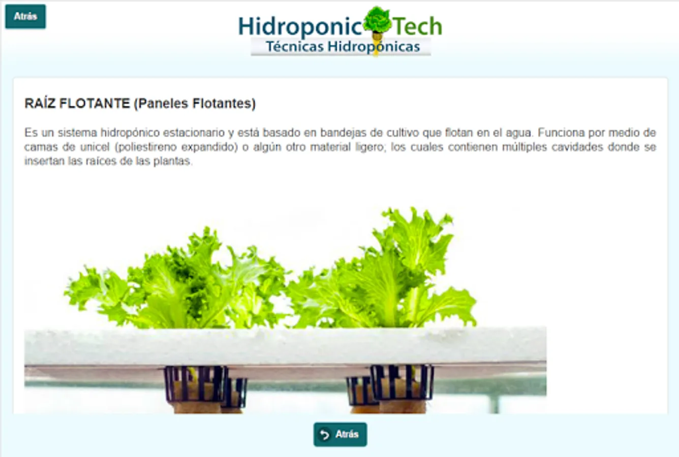 Tech Hidroponic, is an App that will allow you to know in a didactic and summarized way the different techniques or hydroponic systems (Hydroponics in substrate, The NFT, Floating Root, Aquaponics, Aeroponics, Modular in Cascade) most used today and thus you can choose the that best suits the desired output of your project.