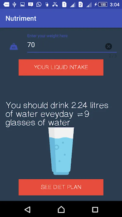 Nutriment provides the best diet plans and water intake to stay fit and healthy.It calculates your BMI(Body mass Index) and gives you the best diet planning and amount water you should intake.