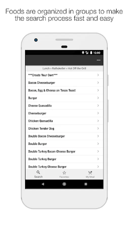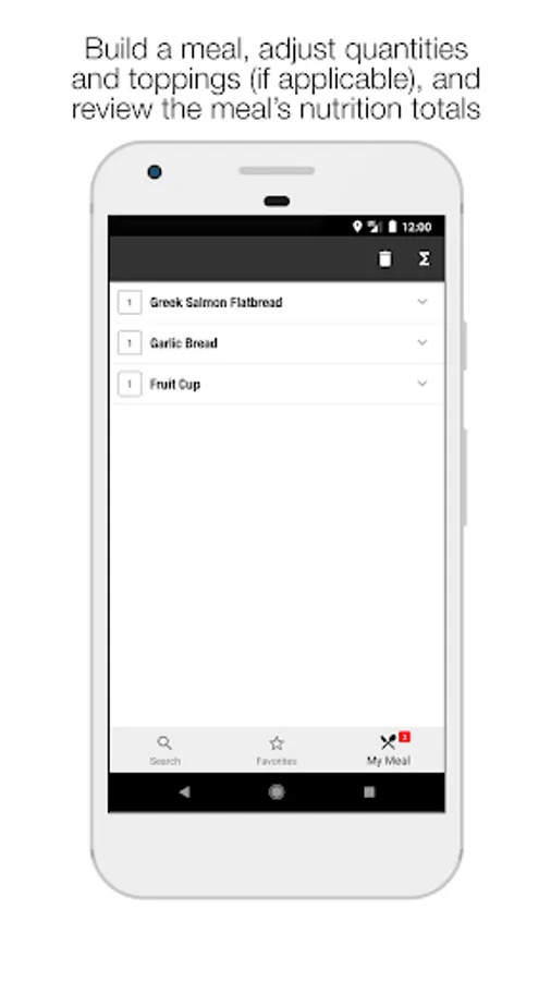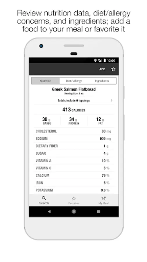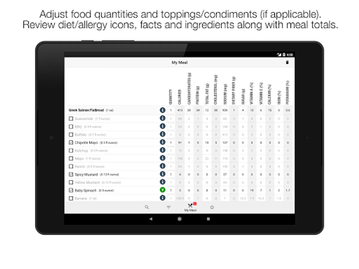 After configuring any toppings/condiments that may be available, add the food to your meal, and review your entire meal total to gain perspective on your dietary choices. And if you eat particular foods on a regular basis, favorite them to expedite future build-a-meal sessions.